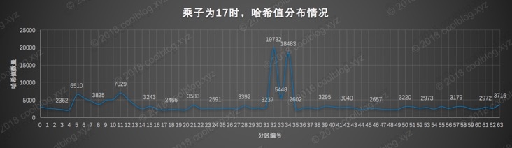 3作为乘子时,算出的哈希值分布情况和2很像,只不过稍微好了那么一点点。从图中可以看出绝大部分的哈希值最终都落在了第32分区里,哈希值的分布性很差。这个也没啥用,拖出去枪毙5分钟吧。在看看数字17的情况怎么样: