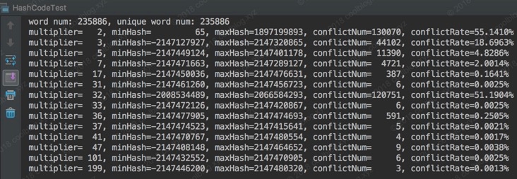正如 Goodrich 和 Tamassia 指出的那样,如果你对超过 50,000 个英文单词(由两个不同版本的 Unix 字典合并而成)进行 hash code 运算,并使用常数 31, 33, 37, 39 和 41 作为乘子,每个常数算出的哈希值冲突数都小于7个,所以在上面几个常数中,常数 31 被 Java 实现所选用也就不足为奇了。