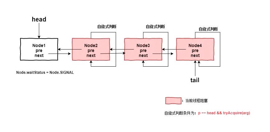 死循环(你也可以叫做自旋)的方式来获取同步状态,如果当前节点的上一节点是head指向的节点且该节点获取同步状态成功,那么会设置head指向该节点 ,同时将上一节点的next指向断开。
