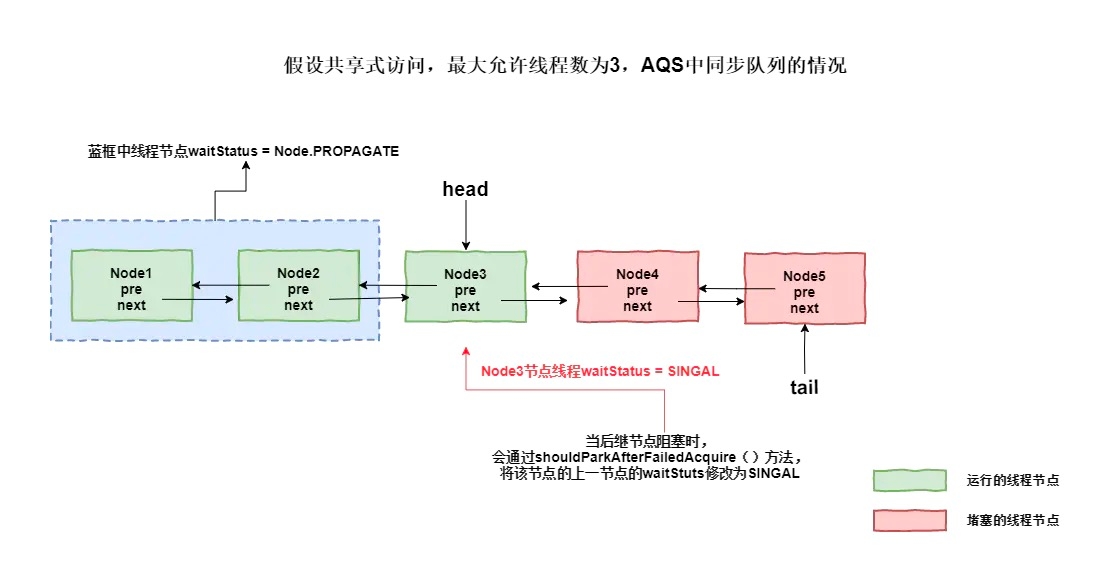 PROPAGATE = -3:与共享式获取同步状态有关,该状态标识的节点对应线程处于可运行的状态。