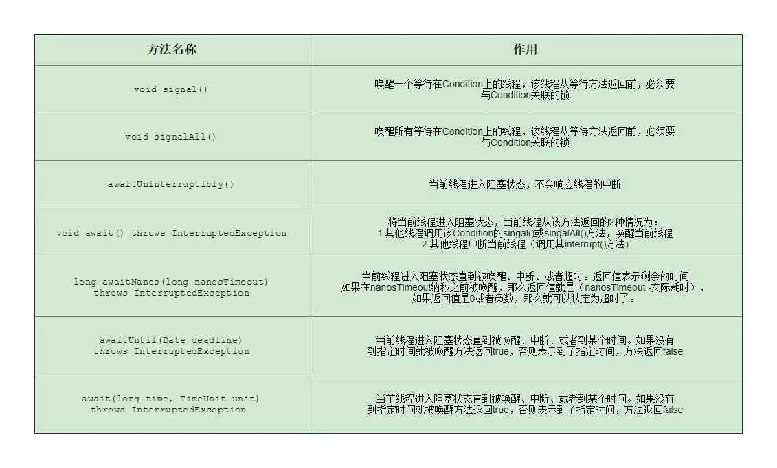 在正式介绍Condtion之前,我们可以先了解其中声明的方法。具体方法声明,如下表所示: