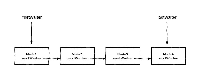 对于等待队列中节点添加的方式也很简单,将上一尾节点的nextWaiter指向新添加的节点,同时使lastWaiter指向新添加的节点。