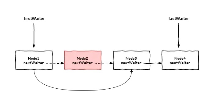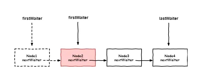 将等待队列中的首节点从等待队列中移除,并设置firstWaiter的指向为首节点的下一个节点。 为了方便大家理解该步骤所描述的逻辑,这里画了具体的图,具体情况如下图所示: