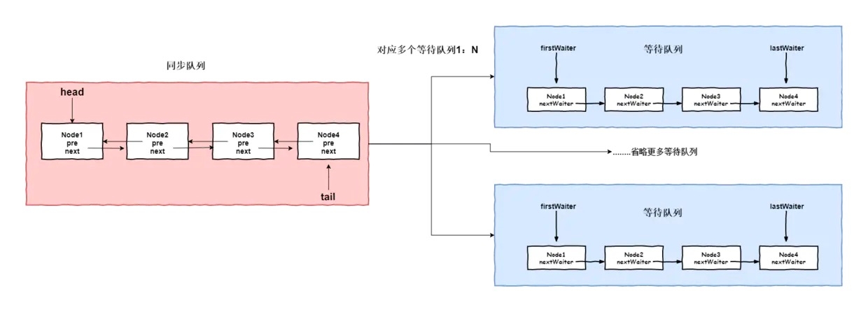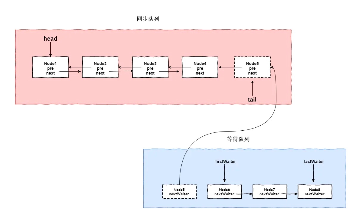 上文提到了整个Lock锁机制需要AQS中的同步队列与ConditionObject的等待队列配合使用,其对应关系如下图所示: