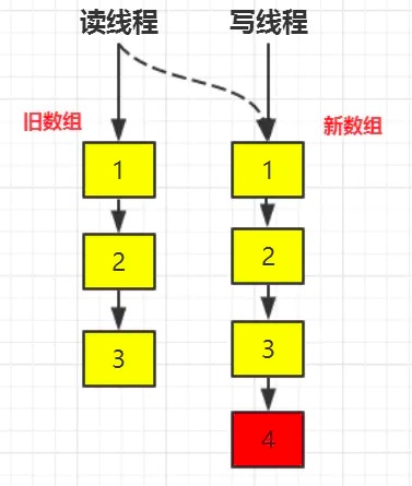 happens-before规则,写线程对数组引用的修改对读线程是可见的。由于在写数据的时候,是在新的数组中插入数据的,从而保证读写实在两个不同的数据容器中进行操作。