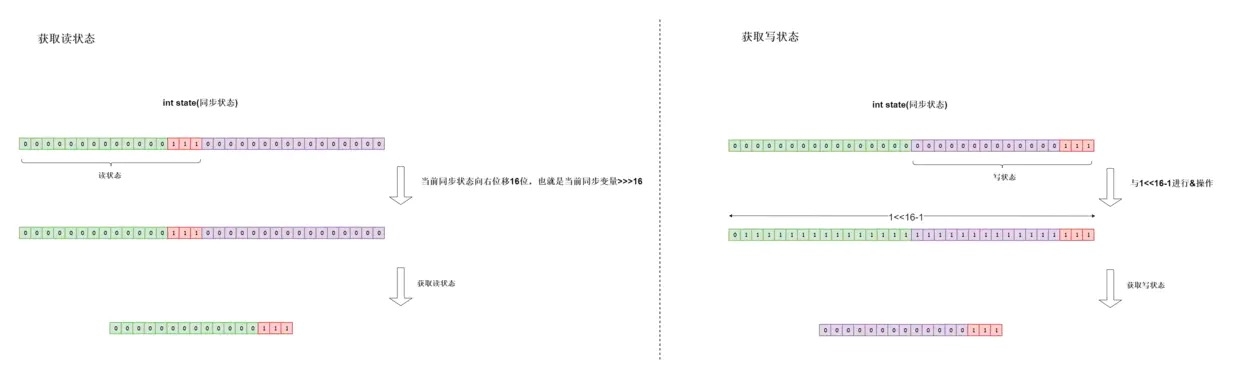 到现在为止我们已经知道同步状态的划分,那接下来又有新的问题了。如何快速的区分及获取读写状态呢?其实也非常简单。