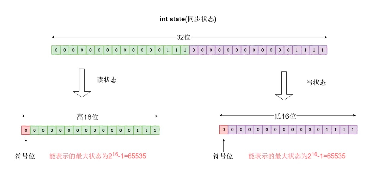 在ReentrantReadWriteLock中的同步队列,其实是将同步状态分为了两个部分,其中高16位表示读状态,低16位表示写状态,具体情况如下图所示: