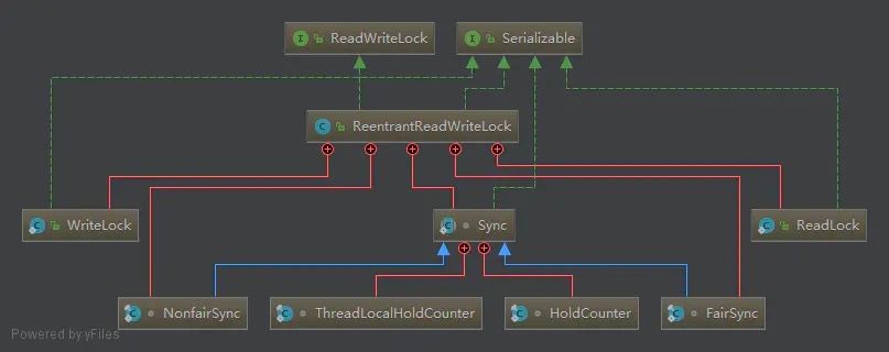 从整体图上来看,ReentrantReadWriteLock实现了ReadWriteLock接口,其中在ReentrantReadWriteLock中分别声明了以下几个静态内部类: