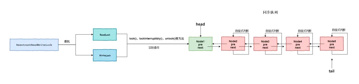 static final class FairSync extends Sync {省略部分代码...}这里我们又看到了我们熟悉的AQS,也就是说WriteLock与ReadLock这两个锁,其实是通过AQS中的同步队列来对线程的进行控制的。那么结合我们之前的AQS的知识,我们可以得到下图: