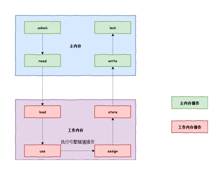 一个新的变量只能在主内存中诞生,工作内存要使用或者赋值。必须要经过load或assign操作。