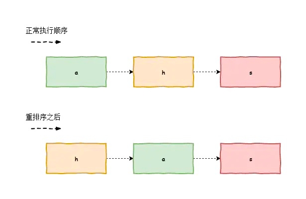 如上图所示:a与s存在数据依赖关系,同时h与s也存在依赖关系。因此在程序的最终指令执行时。s是不能排在a与h之前。因为a与h不存在着数据依赖关系。所以处理器可以对a与h之前的执行顺序重排序。