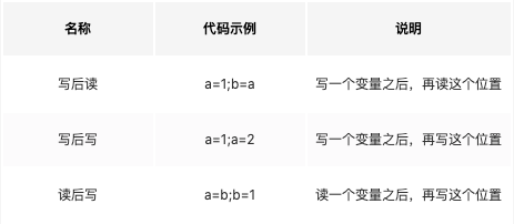 如果两个操作访问同一个变量,且这两个操作中有一个为写操作,此时这两个操作之间就存在数据依赖性。如下图所示: