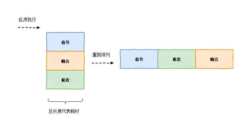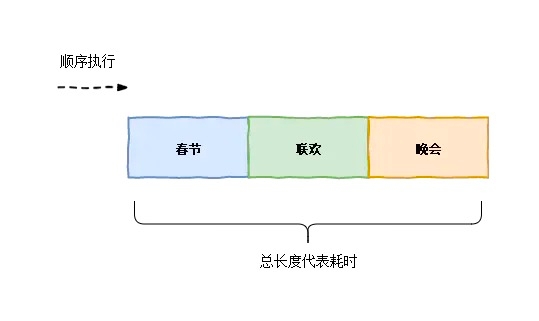 假如请A、B、C三个名人为晚会题写横幅“春节联欢晚会”六个大字,每人各写两个字。如果这时在一张大纸上按顺序由A写好"春节"后再交给B写"联欢",然后再由C写"晚会",那么这样在A写的时候,B和C必须等待,而在B写的时候C仍然要等待而A已经没事了。