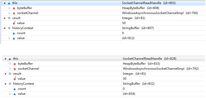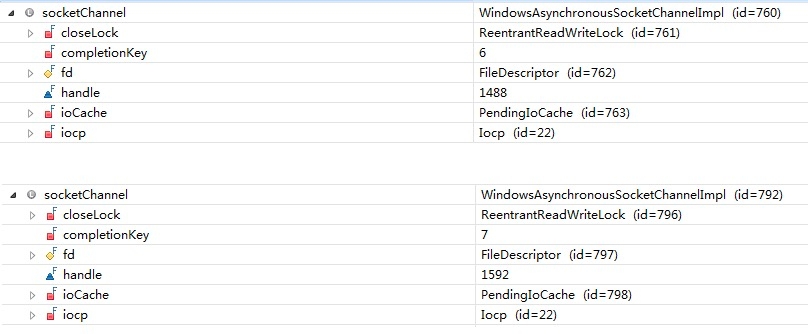可以看到,在服务器端分别为客户端1和客户端2创建的两个WindowsAsynchronousSocketChannelImpl对象为: