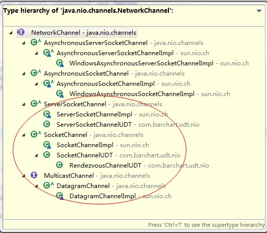 特别说明一下,请注意图中的“java.nio.channels.NetworkChannel”接口,这个接口同样被JAVA NIO框架实现了,如下图所示: