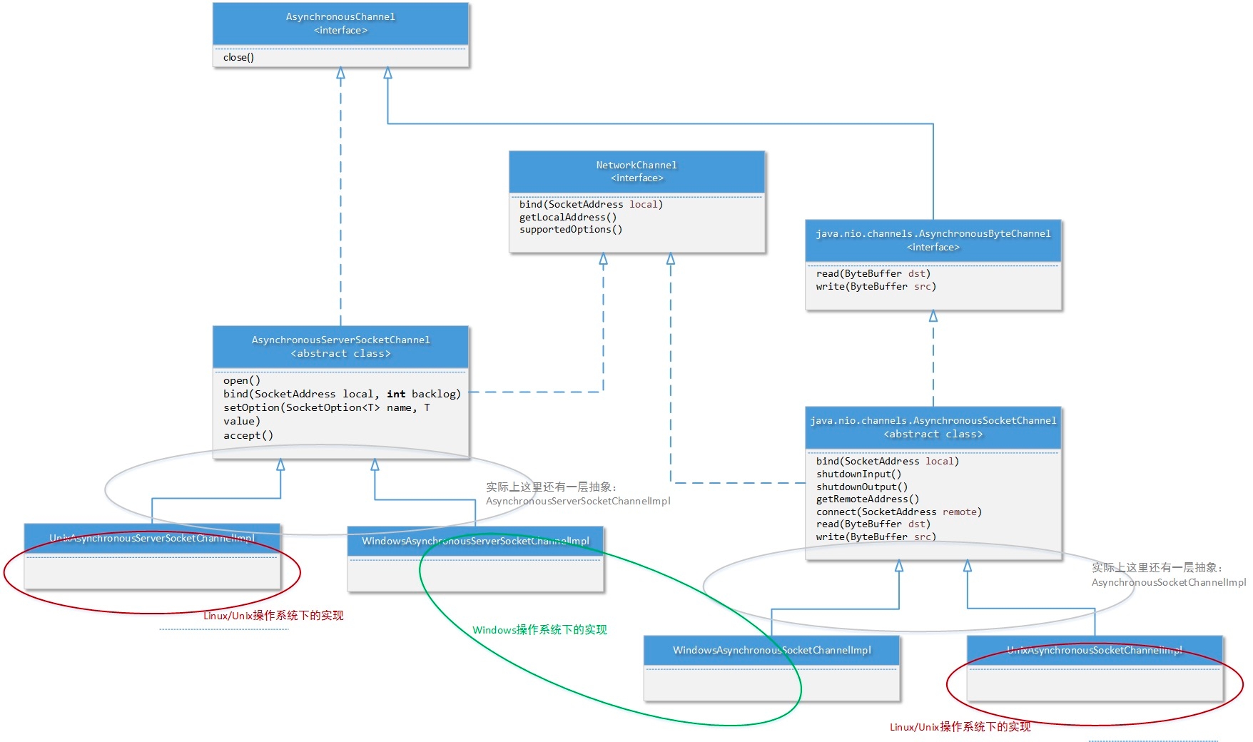 这里通过这个结构分析要告诉各位读者JAVA AIO中类设计和操作系统的相关性。