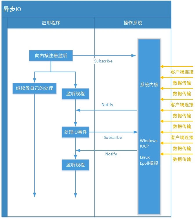 异步IO则是采用“订阅-通知”模式: 即应用程序向操作系统注册IO监听,然后继续做自己的事情。当操作系统发生IO事件,并且准备好数据后,在主动通知应用程序,触发相应的函数: