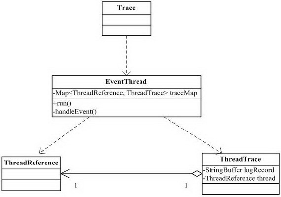 EventThread负责从虚拟机实例的事件队列中获取事件,交由对应的ThreadTrace处理,它同时维护着一张ThreadReference和ThreadTrace一一对应关系的映射表;ThreadTrace负责分析ThreadReference信息,并将结果记录在logRecord的缓存中,每个ThreadTrace实现了单个线程信息的追踪,详见图 1。