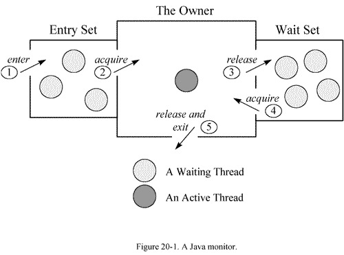 Waiting for Monitor Entry 和 in Object.wait():The thread is waiting to get the lock for an object (some other thread may be holding the lock). This happens if two or more threads try to execute synchronized code. Note that the lock is always for an object and not for individual methods.