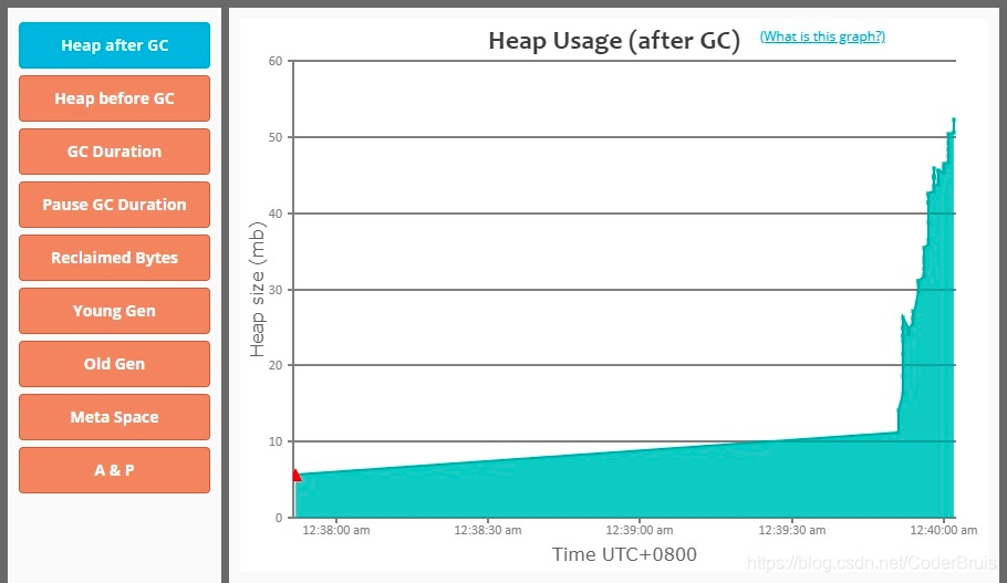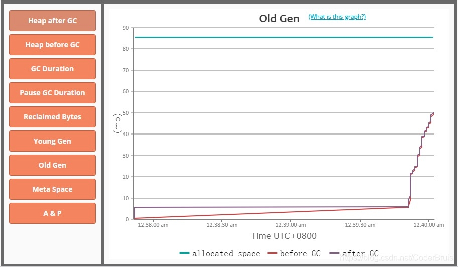 第一部分是Heap after GC,GC后堆的内存图,堆是用来存储对象的,从图中可以看出,随着GC的进行,垃圾回收器把对象都回收掉了,因此堆的大小逐渐增大。