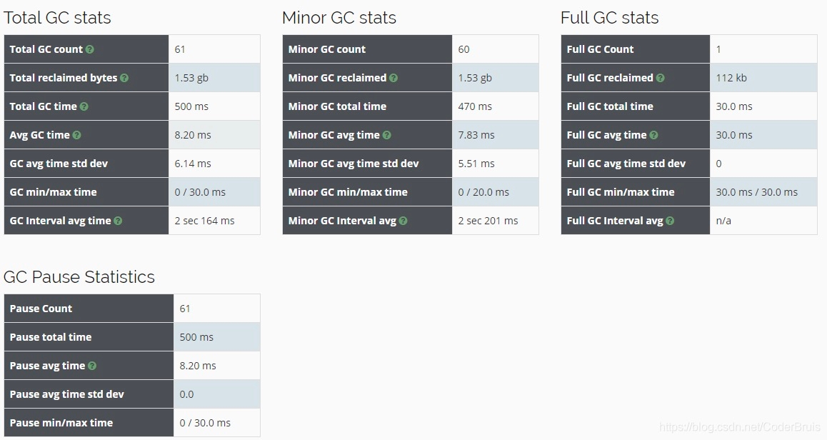 接下来则分别表示的是总GC统计,MinorGC的统计,FullGC的统计,GC暂停程序的统计。