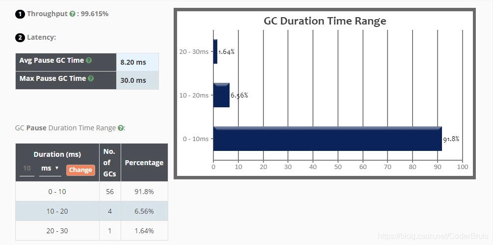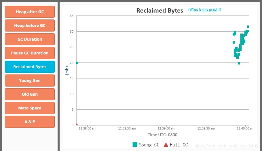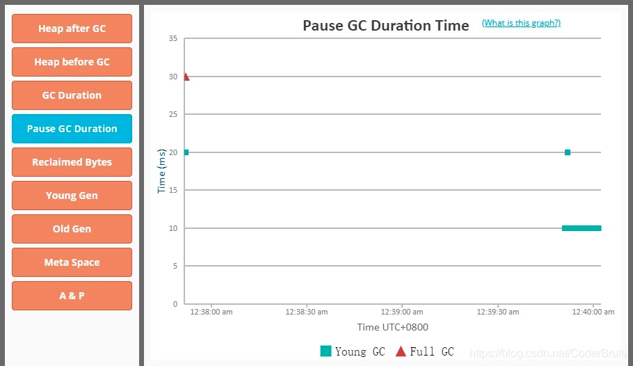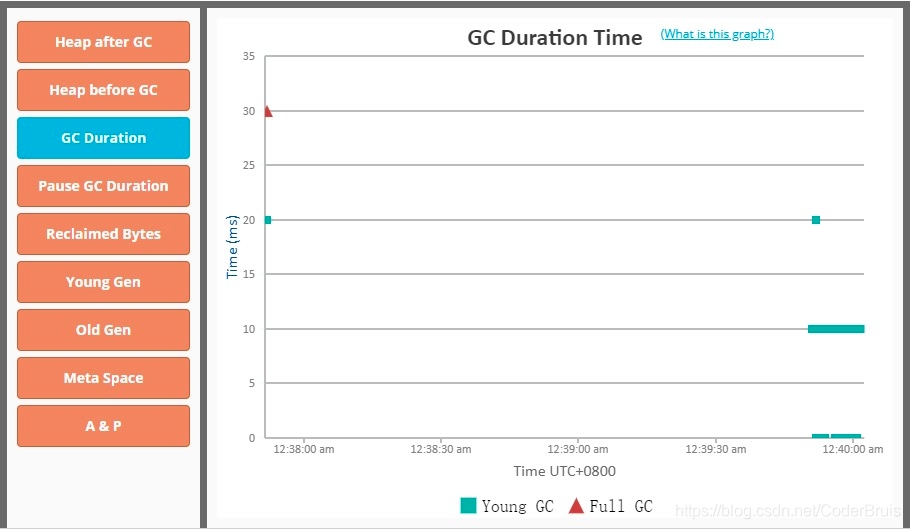 第三部分是GC Duration Time,就是GC持续时间。从图中可以看到,发生Full GC的时间持续的比较端,而Young GC持续的时间比较长。图中横坐标表示GC发生的时间段,纵坐标表示的是GC持续时间。
