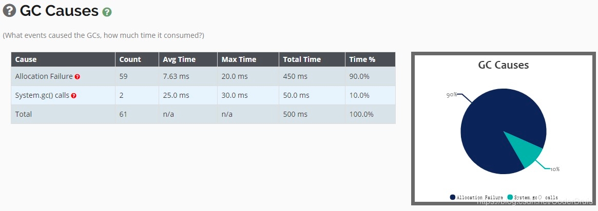 第四部分表示的是GC导致程序停顿持续的时间,一个GC事件的发生具有多个阶段,而不同的垃圾回收器又有不同的阶段,这里展示不作细分。这些阶段(例如并发标记,并发清除等)与程序线程一起并发运行,此时不会暂停程序线程。但是某些阶段(例如初始标记,清除等)会暂停整个应用程序,所以此图标描述的仅暂停阶段所花费的时间。