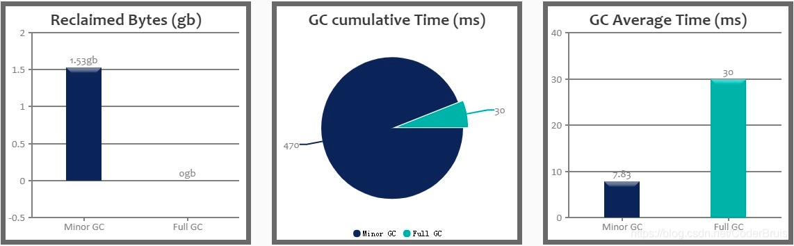 左图:表示的是堆内存中Minor GC和Full GC回收垃圾对象的内存。 中图:总计GC时间,包括Minor GC和Full GC,时间单位为ms。 右图:GC平均时间,包括了Minor GC和Full GC。