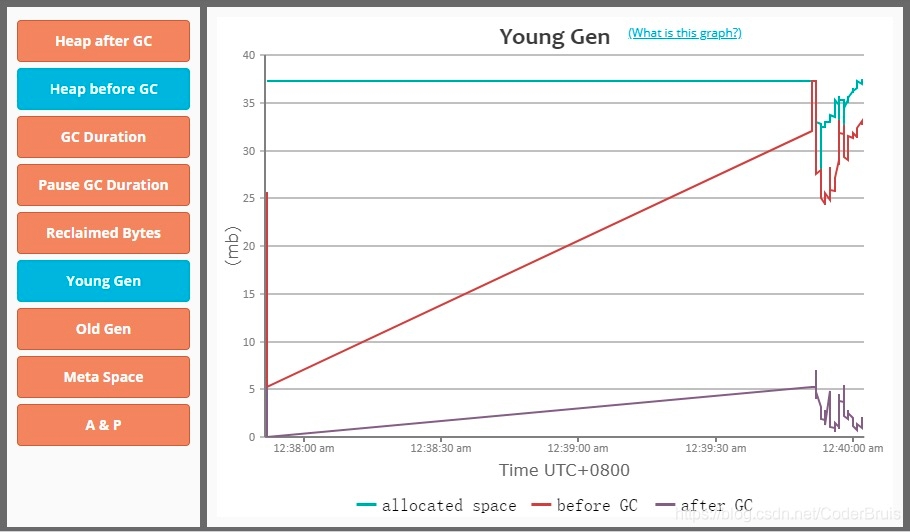 第六部分表示的是Young Gen,年轻代的内存分配情况。对象都是朝生夕死,年轻代存放的就是刚刚产生的对象,每进行一次GC,都会GC掉很多垃圾对象,剩下的就是右GC Root关联的对象,这些对象会年龄会逐渐增加,达到了一定阈值就会晋升为老年代的对象。可以看到before GC表示的图线随着时间的进行逐渐增大,也就是年轻代中对象越来越多,而GC事件发生后,年轻代中对象就会减少,也就是after GC图线表示的内存变化趋势。