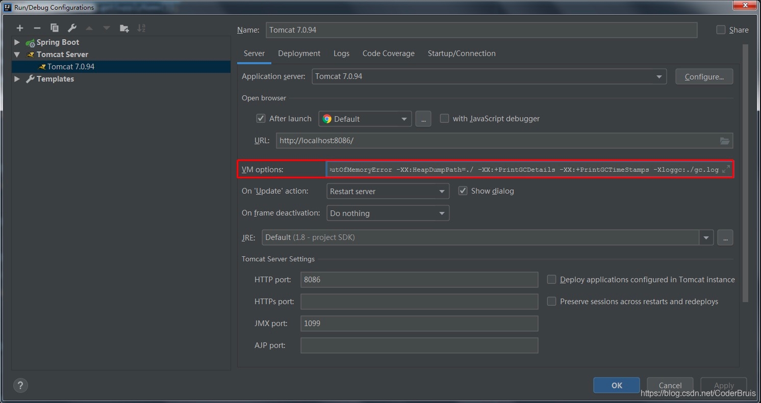 可能很多读者都不知道如何打印出程序的GC日志,下面来介绍分别使用IDEA输出GC日志和直接从Tomcat服务器上输出GC日志。其实这两种方式都使用了同样的JVM命令: