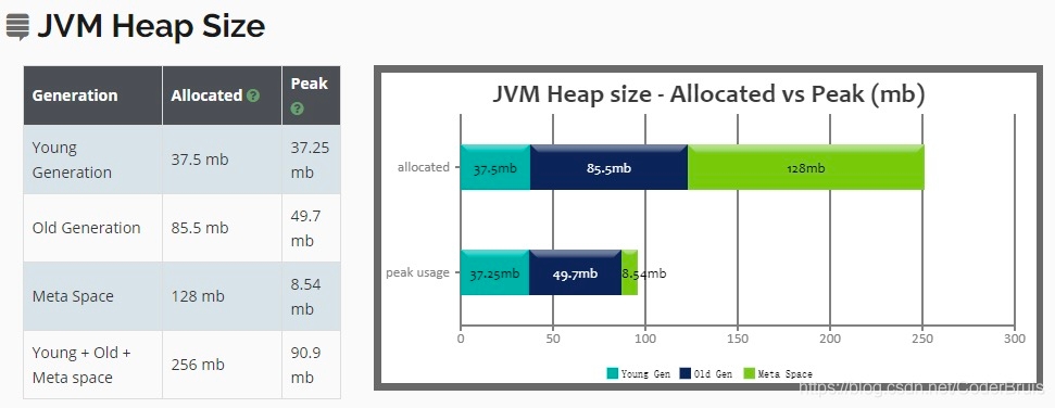 左侧分别展示了年轻代的内存分配分配空间大小(Allocated)和年轻代内存分配空间大小的最大峰值(Peek),然后依次是老年代(Old Generation)、元数据区(Meta Space)、堆区和非堆区(Young + Old + Meta Space)总大小。值得注意的是,每一代的最大内存利用率都会超过分配的大小,但是图中的内存分配利用率已经超过了峰值内存了。