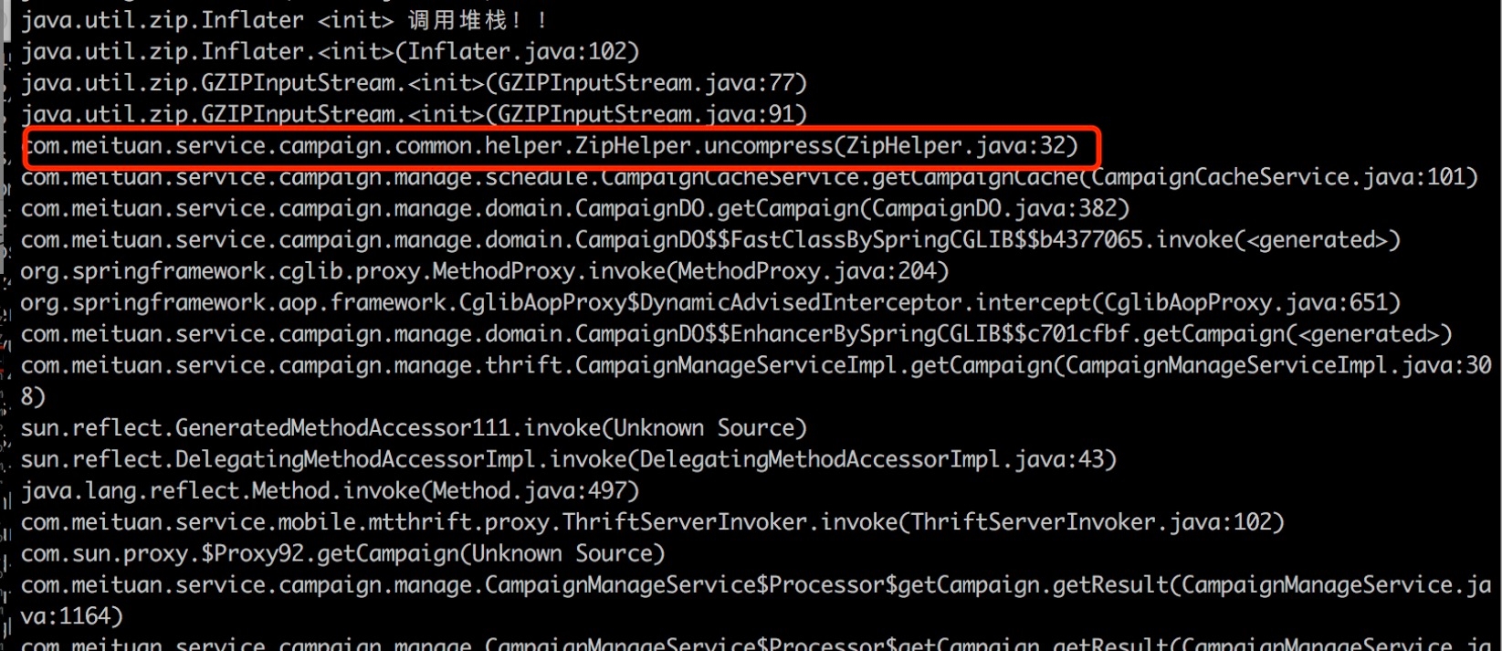 接下来可以使用 Btrace,尝试定位具体的调用栈。Btrace 是 Sun 推出的一款 Java 追踪、监控工具,可以在不停机的情况下对线上的 Java 程序进行监控。如下图所示,通过 Btrace 定位出项目中的 ZipHelper 在频繁调用 GZIPInputStream ,在堆外内存分配对象。