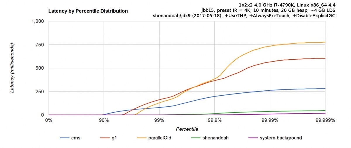 Shenandoah: 由 Red Hat 的一个团队负责开发,与 G1 类似,基于 Region 设计的垃圾收集器,但不需要 Remember Set 或者 Card Table 来记录跨 Region 引用,停顿时间和堆的大小没有任何关系。停顿时间与 ZGC 接近,下图为与 CMS 和 G1 等收集器的 benchmark。