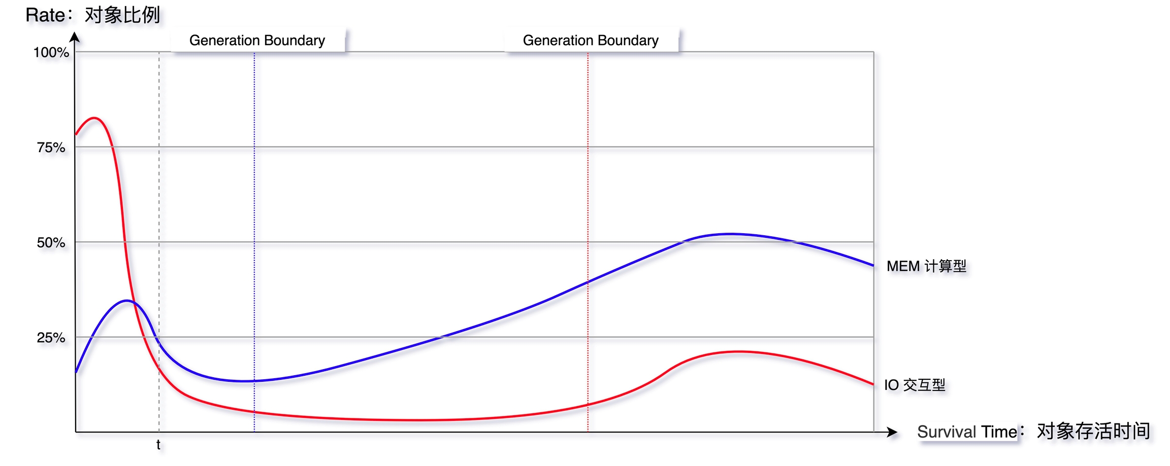 Mutator 的类型根据对象存活时间比例图来看主要分为两种,在弱分代假说中也提到类似的说法,如下图所示 “Survival Time” 表示对象存活时间,“Rate” 表示对象分配比例: