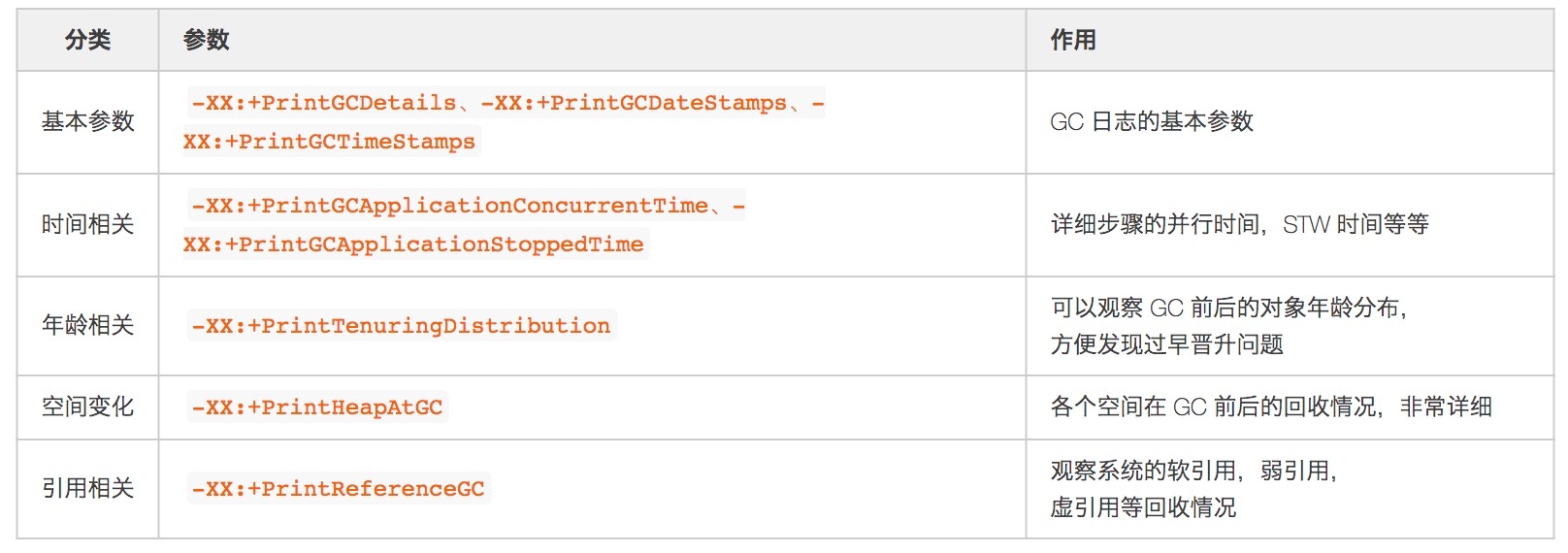 GC 参数: 如果堆、栈确实无法第一时间保留,一定要保留 GC 日志,这样我们最起码可以看到 GC Cause,有一个大概的排查方向。关于 GC 日志相关参数,最基本的