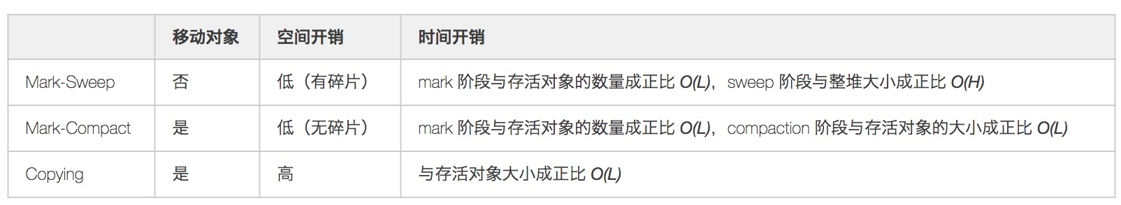 三种算法在是否移动对象、空间和时间方面的一些对比,假设存活对象数量为 L、堆空间大小为 H,则: