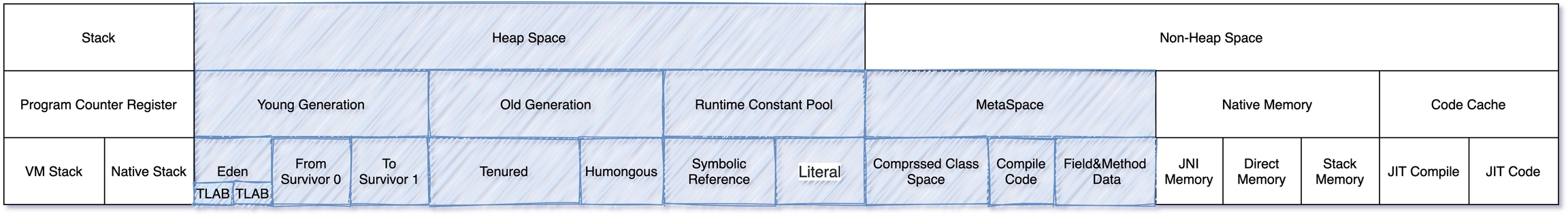 目前使用最多的是 CMS 和 G1 收集器,二者都有分代的概念,主要内存结构如下: