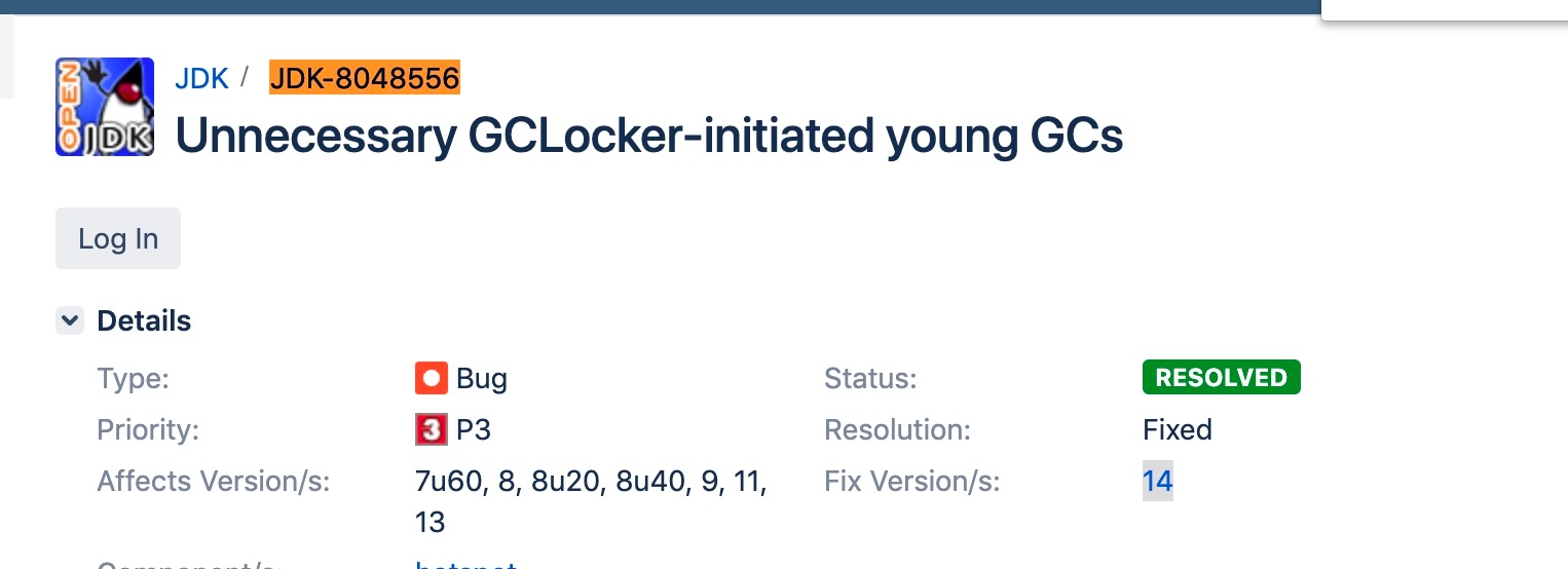 可能触发额外不必要的 Young GC,JDK 有一个 Bug,有一定的几率,本来只该触发一次 GCLocker Initiated GC 的 Young GC,实际发生了一次 Allocation Failure GC 又紧接着一次 GCLocker Initiated GC。是因为 GCLocker Initiated GC 的属性被设为 full,导致两次 GC 不能收敛。