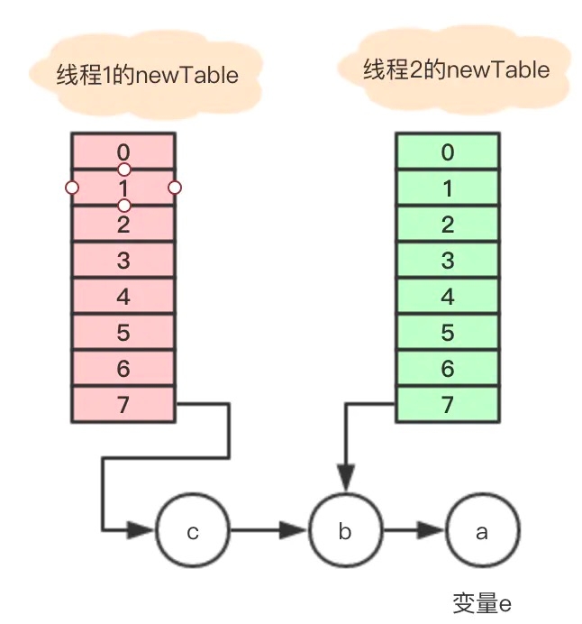 假设 线程2 在执行到Entry<K,V> next = e.next;之后,cpu时间片用完了,这时变量e指向节点a,变量next指向节点b。