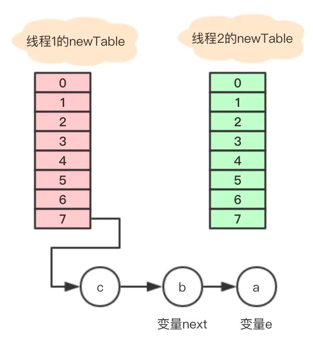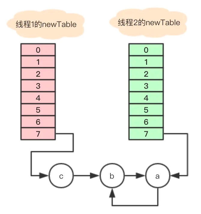 2、e.next = newTable[i]; 其中 newTable[i] 指向节点b,那就是把a的next指向了节点b,这样a和b就相互引用了,形成了一个环;