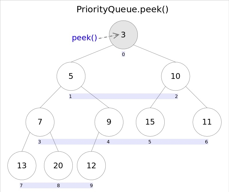 element()和peek()的语义完全相同,都是获取但不删除队首元素,也就是队列中权值最小的那个元素,二者唯一的区别是当方法失败时前者抛出异常,后者返回null。根据小顶堆的性质,堆顶那个元素就是全局最小的那个;由于堆用数组表示,根据下标关系,0下标处的那个元素既是堆顶元素。所以直接返回数组0下标处的那个元素即可。