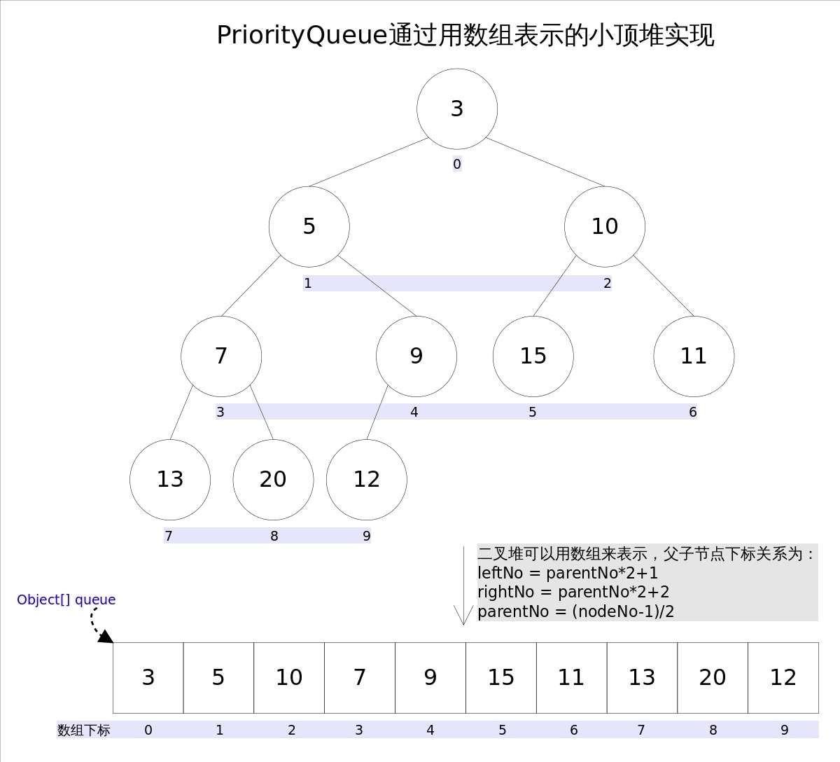 Java中PriorityQueue实现了Queue接口,不允许放入null元素;其通过堆实现,具体说是通过完全二叉树(complete binary tree)实现的小顶堆(任意一个非叶子节点的权值,都不大于其左右子节点的权值),也就意味着可以通过数组来作为PriorityQueue的底层实现。