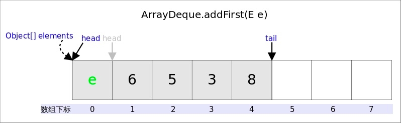 addFirst(E e)的作用是在Deque的首端插入元素,也就是在head的前面插入元素,在空间足够且下标没有越界的情况下,只需要将elements[--head] = e即可。