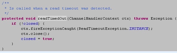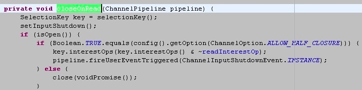 下面我们一起看下服务端是如何判断出客户端关闭连接的,当连接被对方合法关闭后,被关闭的 SocketChannel 会处于就绪状态,SocketChannel 的 read 操作返回值为 -1,说明连接已经被关闭,代码如下: