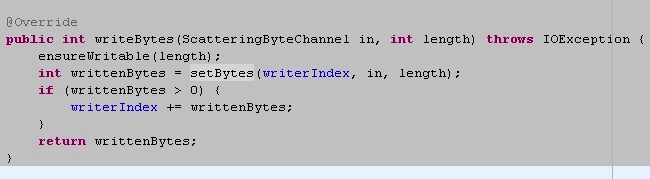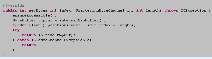 下面我们一起看下 Netty 是如何感知到链路关闭异常并进行正确处理的,查看 AbstractByteBuf 的 writeBytes 方法,它负责将指定 Channel 的缓冲区数据写入到 ByteBuf 中,详细代码如下: