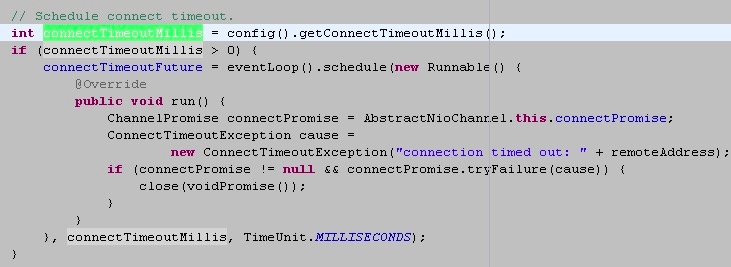 设置完连接超时之后,Netty 在发起连接的时候,会根据超时时间创建 ScheduledFuture 挂载在 Reactor 线程上,用于定时监测是否发生连接超时,相关代码如下: