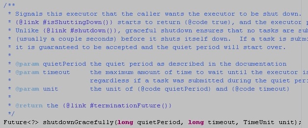 首先看下 Reactor 线程和线程组,它们提供了优雅退出接口。EventExecutorGroup 的接口定义如下: