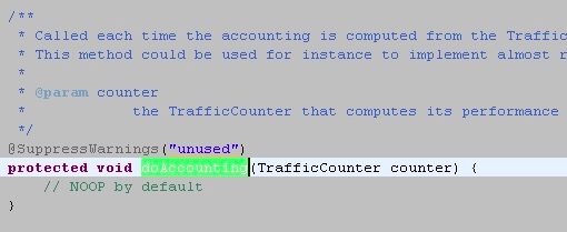 它的实现原理与全局流量整形类似,我们不再赘述。值得说明的是,Netty 支持用户自定义流量整形策略,通过继承 AbstractTrafficShapingHandler 的 doAccounting 方法可以定制整形策略。相关接口定义如下: