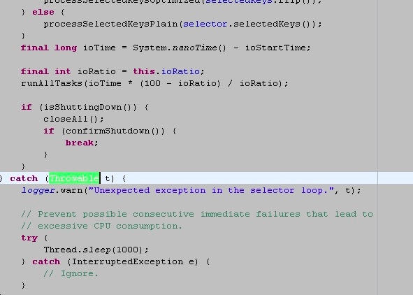 尽管 Reactor 线程主要处理 IO 操作,发生的异常通常是 IO 异常,但是,实际上在一些特殊场景下会发生非 IO 异常,如果仅仅捕获 IO 异常可能就会导致 Reactor 线程跑飞。为了防止发生这种意外,在循环体内一定要捕获 Throwable,而不是 IO 异常或者 Exception。