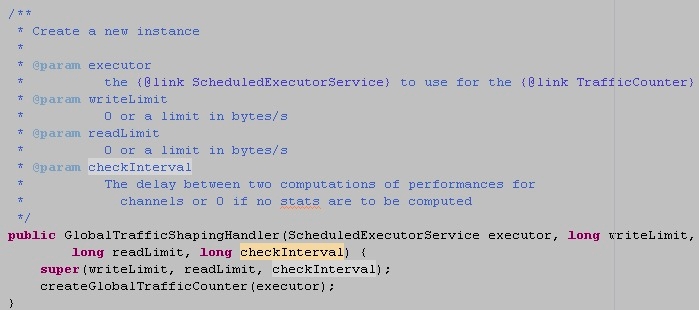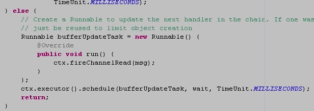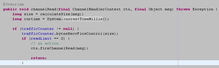 Netty 流量整形的原理是:对每次读取到的 ByteBuf 可写字节数进行计算,获取当前的报文流量,然后与流量整形阈值对比。如果已经达到或者超过了阈值。则计算等待时间 delay,将当前的 ByteBuf 放到定时任务 Task 中缓存,由定时任务线程池在延迟 delay 之后继续处理该 ByteBuf。相关代码如下: